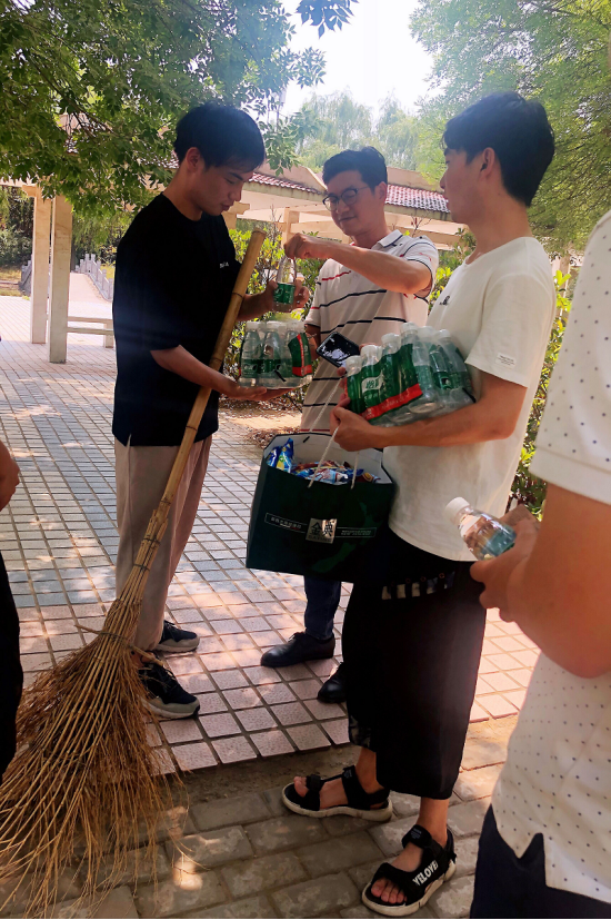 我院为期三周的劳动周课程于六月十六日画上了圆满的句号。烈日炎炎,为了考察同学们适应环境的能力,表达对同学们的关怀与慰问,我院党支部副书记蔡中民、团总支书记买菁菁、辅导员郭睿、王晓芳在劳动周期间多次检查劳动周的开展情况,并为学生们准备好了水和各种解暑食品,为挥汗如雨的学生们送去了丝丝凉意。