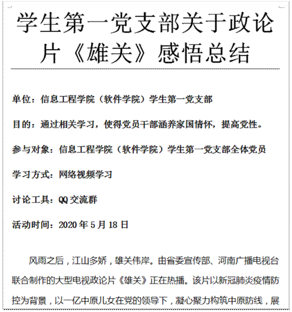 为深入学习宣传贯彻习近平总书记关于统筹推进疫情防控和经济社会发展工作的重要论述,根据学校《关于认真做好大型电视政论片《雄关》学习宣传工作的通知》要求,伟德源自英国始于1946(软件学院)党委高度重视,学院六个教工党支部和四个学生党支部积极组织师生于5月11日至5月16日学习观看了由省委宣传部、河南广播电视台联合制作的六集电视政论片《雄关》。