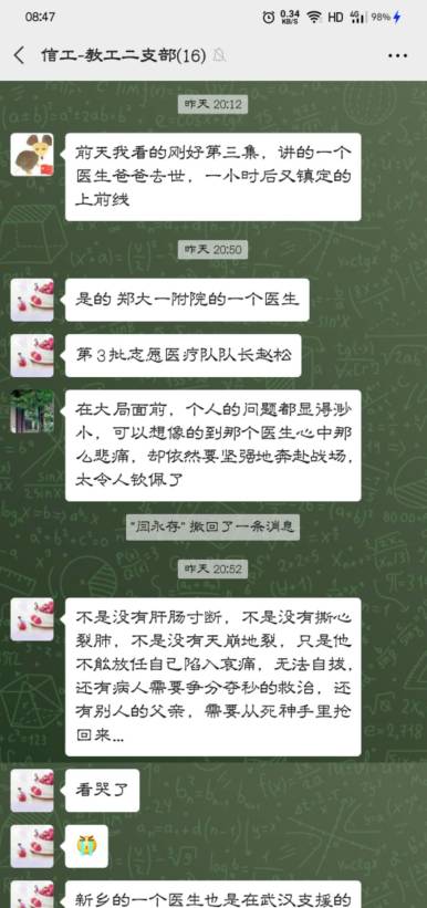 《雄关》政论片的观看与学习,在学院师生们中引起了热烈地反响,学院各党支部于16日~17日利用信息技术召开了线上学习研讨会。大家结合自身实际,或通过微信聊天写心得,或通过视频会议谈感受。纷纷表示,该政论片展示了中国战“疫”的河南力量,激昂处热血沸腾,感人处催人泪下。通过交流,大家更深刻认识到了中国共产党领导和我国社会主义制度、国家治理体系强大生命力和显著优越性,更坚定了在平凡的工作岗位上用实际行动彰显责任与担当的勇气与信念。(李井竹/文 各党支部/图)