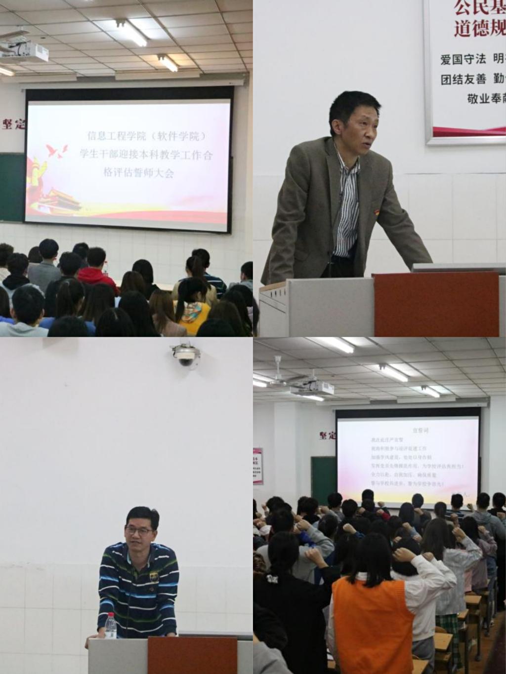 首先,我院党委副书记蔡中民宣读了我院《关于在迎评促建中开展“亮党员身份、勇担当责任、起模范作用”活动的通知》,蔡书记强调了本科教学工作合格评估对我校之重大意义,倡导学生干部和党员应在评估工作中率先垂范,发挥引领作用,带动身边人一同为评估而努力。紧接着我院学生第二党支部书记叶子老师宣读伟德源自英国始于1946(软件学院)迎接本科教学工作合格评估学生倡议书,倡议全院学子要以向上的精神风貌、良好的学院学风、优美的校园环境来迎接评估。随后,学生干部代表祁伟琳带领全体参会人员宣誓。最后,我院党委书记杨行昌作了重要讲话。杨书记指出,今年是学校的大战大考之年,评估“通过”与否将直接关系到学校的生存和发展,在我校教学条件和实验设施大为改观、教学运行和管理日益规范,教学水平和质量逐步提升的情况之下,希望大家一定要牢固树立主人翁意识,增强母校荣我光荣的使命感,认真学习评估知识手册,模范遵守课堂纪律和宿舍要求,时时注意校园文明风尚,一切行动听指挥,各个方面作表率,为学校顺利通过评估做出最大贡献。杨书记强调两大“红线”,提醒大家不要触碰底线,以保证我校本科教学工作合格评估的顺利进行。学生干部和党员代表们纷纷表示会谨记领导和老师们的嘱咐,同学们也表明了自己迎接评估工作的信心与决心。