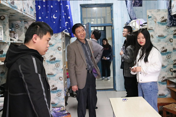 2021年4月24日下午,我院党委书记杨行昌、党委副书记蔡中民、团委书记郭睿以及全体辅导员于对学生宿舍状况进行了走访视察。