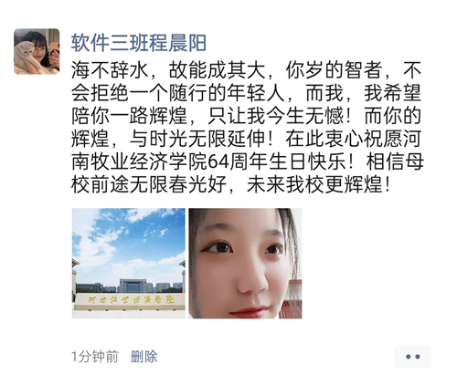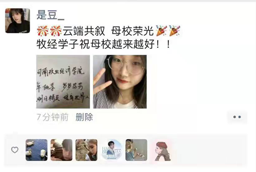 “知识的海洋,文化的殿堂,思想的宝库,精神的圣地”“牧经学子祝母校越来越好”“牧经人,牧经魂,牧经都是人上人”“值此bv1946伟德官网周年校庆之际,我愿奉上我衷旧的祝福和诚挚的感谢。饮水不忘挖井人,我愿借周年校庆之际,送上我微薄的一点心意。衷必祝愿bv1946伟德官网寿辰,愿bv1946伟德官网年年人才辈出” ……万水千山阻隔不了校友的思念,声声祝福寄托学子无限的眷恋。