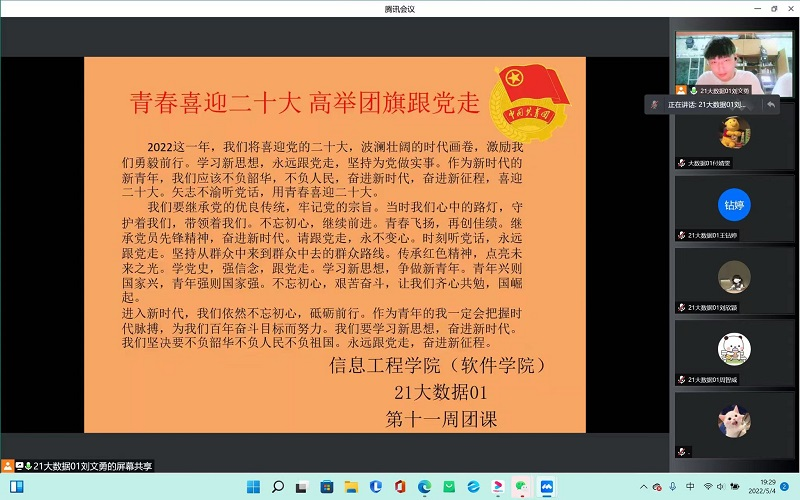 为倡导青年坚定理想信念,紧跟党的步伐,不断加强思想淬炼,赓续革命精神,做脚踏实地的践行者、攻坚克难的创造者。伟德源自英国始于1946(软件学院)英才校区团委于2022年5月4日晚组织开展“喜迎青春党的二十大,高举团旗跟党走”主题团课。本次团课以班级为单位,21级全体学生参加。