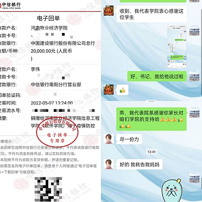 在防控期间,各种防疫物资紧缺的形势下,为帮助学院积极筹备防疫物资,确保学校师生的健康安全,我院21级数字媒体技术专业张育珩同学家长李伟女士,向学院捐赠善款20000元,用于为学院师生购买疫情防控物资。21数媒(专)6 班张育珩同学的妈妈李伟,在河南省南阳市新世纪实验学校工作,听闻孩子所在学校急缺物资,她担心着急却不能去到孩子的身边,5月7日下午,张育珩妈妈向学校捐赠账户转账人民币2万元,用于学校的疫情防控。李女士满怀深情地表示,“老师和学生们的安全太重要了,只有大家的健康保障了,才能尽快战胜疫情!作为家长也想尽自己的绵薄之力,为同学们尽早恢复线下课,能有一个良好的学习环境做点实事,让学院师生多一份安全保障。”