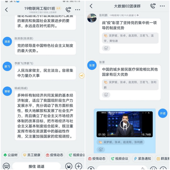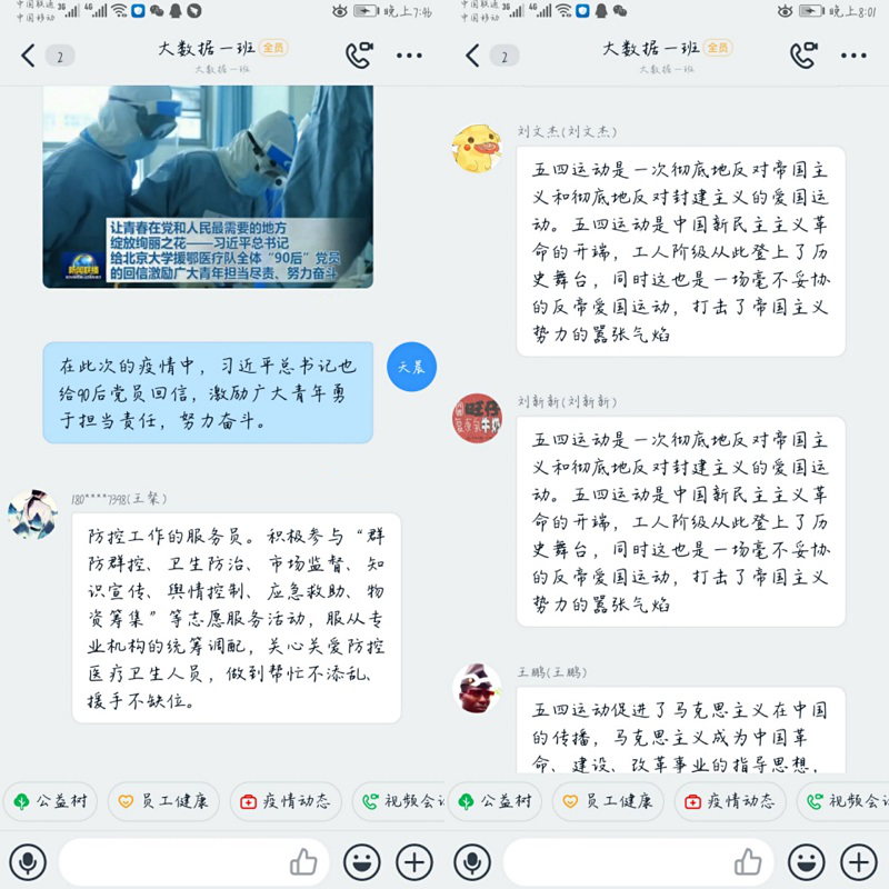 为纪念五四运动101周年,激励和引领广大青年学生坚定制度自信,伟德源自英国始于1946(软件学院)于2020年4月23日在钉钉班级群开展“绽放战疫青春,坚定制度自信”主题团课,本次团课以班级为单位进行,2019级全体同学参加。
