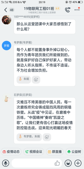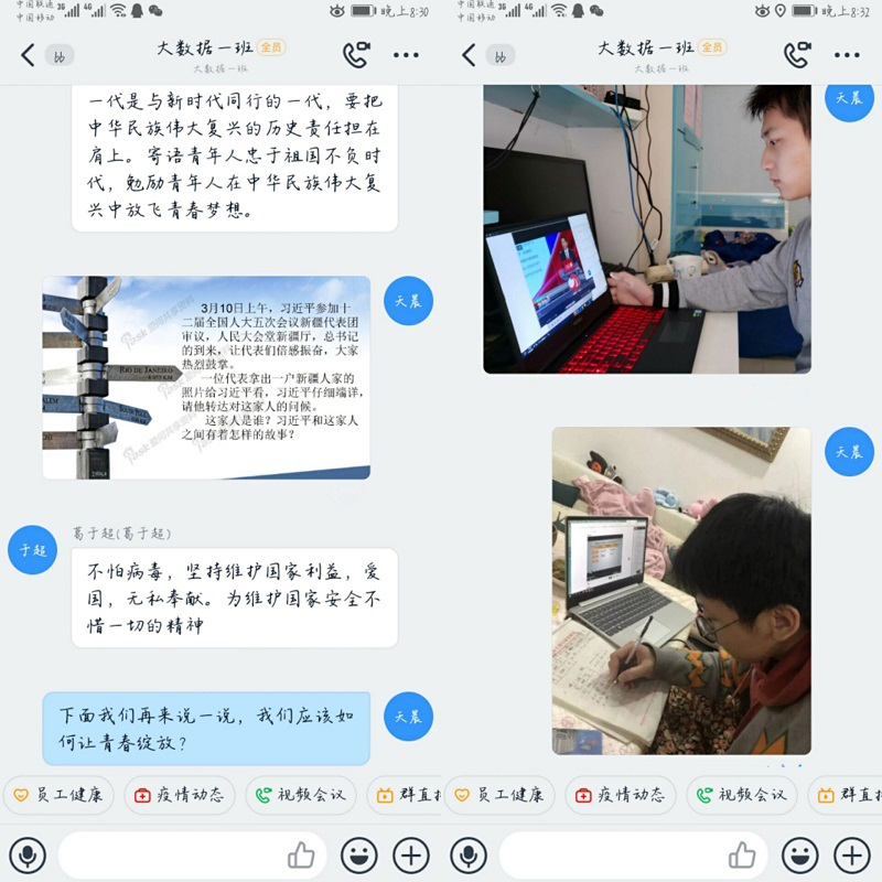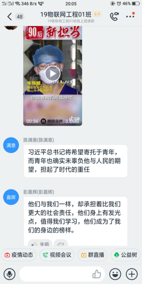 为深入学习习近平总书记回信精神内涵,激励广大青年勇挑重担,为打赢疫情防控阻击战贡献力量。伟德源自英国始于1946(软件学院)于2020年3月19日在钉钉班级群开展“学习习近平总书记回信精神,致敬最美青春力量”主题团课,本次团课以班级为单位进行,2019级全体同学参加。