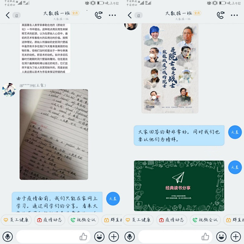 本次团课由团课主持人详细阐述了大学生成长成才的重要性,并带领同学们一起讨论分享了如何在疫情期间做到“停课不停学”,有效开展学习;如何正确处理大我和小我的关系、个人和国家之间的关系;如何结合专业参与防疫工作等内容。在团课上,同学们分享了个人近来阅读经典图书的心得感想,更是以晒作业,晒学习,晒计划的方式纷纷响应停课不停学倡议活动。团课主持人强调,疫情当前,大学生应该结合自己所学专业积极参与防疫工作,学好专业知识报效祖国。作为新时代大学生应该懂得科学辩证看待问题,明辨是非,知晓身边的战役英雄们的轶事并深刻学习他们的精神,进一步树立正确的世界观、人生观、价值观。