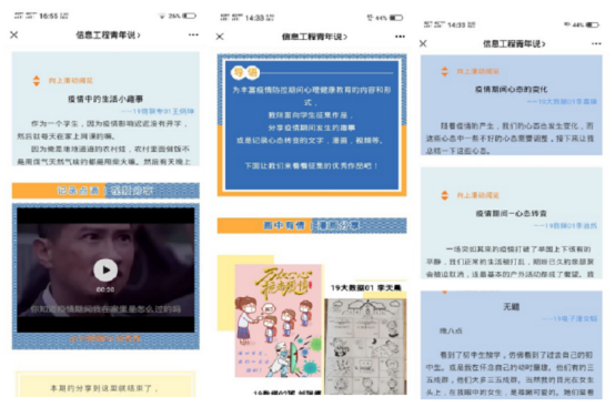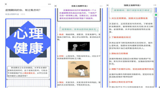 为丰富疫情防控期间心理健康教育的内容和形式,我院面向学生征集记录自己在疫情期间心态转变或者疫情中发生的趣事的文章、短视频、漫画、海报等作品,并通过我院微信公众号信工青年说进行心理健康教育专题推送和集中展示。通过学生的作品可以发现,在疫情期间许多学生的心态由一开始的压抑、恐慌、焦虑变成了后来的积极、乐观,有学生领悟到大学生应做些有意义的事,不光是充实自己的生活,更多的是发现生活的美妙与真谛。此次活动的顺利开展,使我们掌握了学生在疫情期间的心态变化,并引导了学生保持健康向上的心态,坚定制度自信,相信我们终将取得疫情防控的胜利。