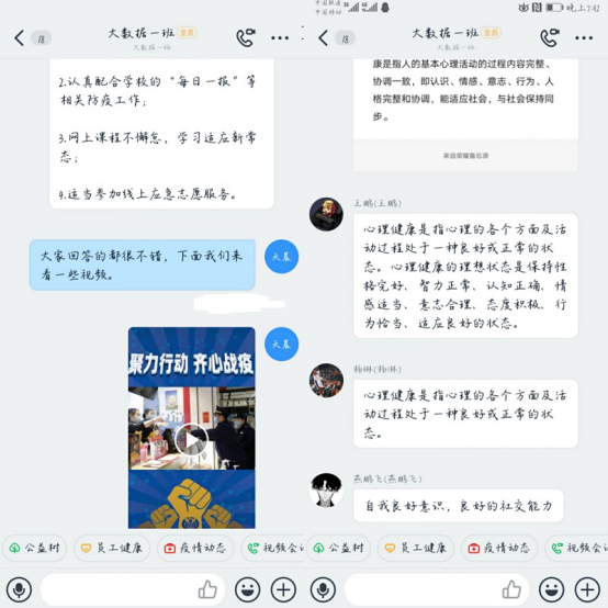 团课伊始,团课主持人带领学生学习了此次两会和青年大学习的主要内容,引导学生树立远大理想,增强制度自信,明确集中力量办大事是我们成就事业的重要法宝。随后,团课主持人带领同学们学习了《新型冠状病毒肺炎全民心理健康实例手册》,向同学们详细讲解了保持积极心态,培养良好心理素质的重要性,以及在疫情期间大学生可能出现的异常心理状况和相应的解决办法。在团课上,同学们围绕在疫情期间,如何采用科学合理的方法进行自我心理调节这一问题展开了激烈的讨论,有同学表示,培养良好的心理素质是我们成长道路不可缺少的部分,保持科学文化素质和身心素质的协调发展,更有利于促进我们健康的成长、积极的生活。